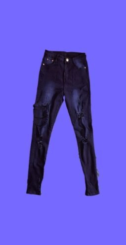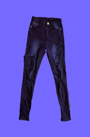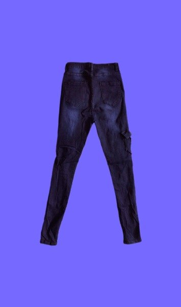 Edgy Dark Wash Distressed Cargo Skinny Jean. Elevate your streetwear game with these unique high-waisted skinny jeans. Featuring a deep indigo wash with strategic fading, these pants offer a perfect mix of grunge and utility.